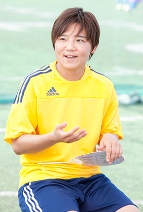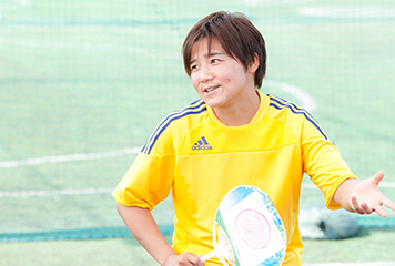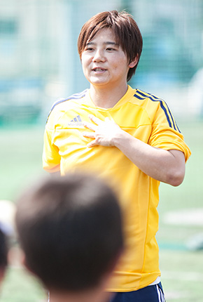 「むずかしいですね~。女性だから、とあまり意識してこなかったので。ただ以前澤選手が『自分がプレイしている姿を子どもに見せたい』という話をしていて、それはいいなあ、と。実際に子どもを産んだあともプレイを続けている選手もいますし。自分の子どもと一緒にサッカーができたら、すごく楽しいでしょうね。今日は母子で参加していただいて、お母さまたちも大活やくだったので、本当にうれしかったです。」