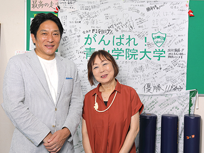 「『4年間の付き合いではなく、人生80年時代、100年プランでお互い考えていこうね』。みんな卒業しても、青山学院原軍団の一員。君の人生尺を4年間だけとらえて付き合うのではなく、卒業して家族が出来て、その子どもがまた青山学院に入りたくなるようなお付き合い、関係になるんだよっていう事を話したいです。」