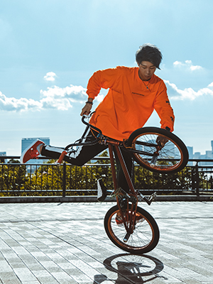 BMXを多くの人に知ってもらうため、様々な場所で幅広くパフォーマンス活動を行い、競技者としても世界大会に出場し続けている数少ないパフォーマー。子ども達にBMXを指導し、育成にも力を注いでいる。