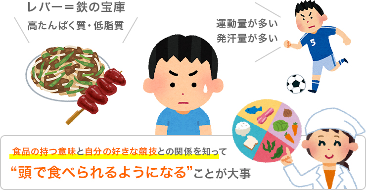 また、レバーは誰でも知っている鉄の宝庫です。鉄と言えば“貧血”とすぐにつながります。そして、貧血と言えば、“女子特有”と思われがちですが、実は運動量が多い、発汗量の多い男子にも貧血はみられます。貧血だと持久力が下がったりするので、ある意味“努力が報われないこと”にもなると思っています。鉄の働きを考えれば分かることですが、私たちの体の中で酸素を全身に運ぶ働きのあるヘモグロビンを構成しているものは鉄とたんぱく質です。その大事な鉄は吸収されにくいものですから、『高たんぱく質・低脂質』で、吸収の良い鉄も多く含まれているレバーは、ぜひ食べられるようになって欲しい代表的な食品です。