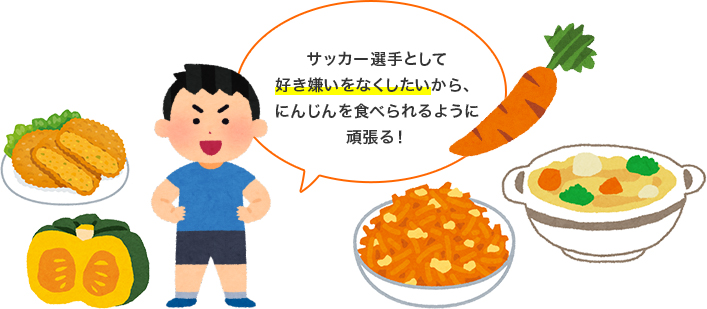 その選手は、最終的ににんじんもしっかり食べるようになったという話を聞いたことがありました。嫌いな食品に多く含まれている栄養素を知って、働きを理解したからと言って、もちろんすぐに嫌いなものが食べられるわけではないと思います。ただ、苦手な食品に含まれる栄養素の働きを知っていれば、“代替品”を探して、ゆとりをもって“嫌いな食品退治”が出来るかもしれません。そしてそれは、まさに“頭で食べる”ことの大事さを本人が理解していることの表れだと思いました。周りの大人も『好き嫌いに向き合える力』を育ててみませんか? ちなみに、その選手のお母さまは、本人に頼まれて毎月1~2回違った種類のにんじんメニューを食べなくても作ってあげていたそうです。