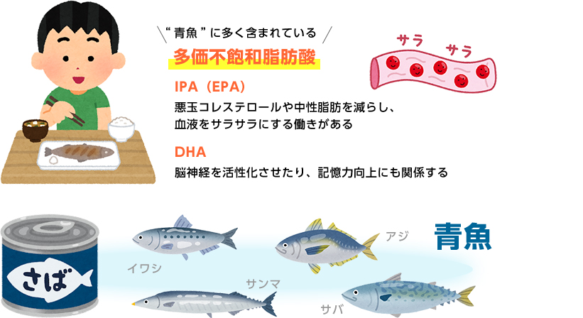 では、“魚の魅力”を改めて確認してみましょう。肉との違いは、何と言っても“脂質”です。魚には、肉に含まれている脂肪酸とは構造や特徴が異なる“多価不飽和脂肪酸”が多く含まれています。多価不飽和脂肪酸の代表的なものとしては、IPA(EPA)やDHAが聞きなれたものではないでしょうか? IPA(EPA)は、悪玉コレステロールや中性脂肪をを減らし、血液をサラサラにする働きがあります。DHAは、脳神経を活性化させたり、記憶力向上にも関係するとも言われている魅力的なものです。これらの多価不飽和脂肪酸は魚の中でも“青魚”に多く含まれているので、ぜひ意識して魚も摂るようにしたいものです。(※青魚とは、さば、あじ、いわし、さんまなど背が青い魚のことを指します。)