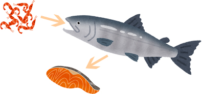 『青魚』『白身魚』という区別を耳にすることがあるかと思います。最近は『鮭はどっちに入るの?』と関心を持たれる方を見かけることもあります。鮭由来のきれいな色を“サーモンピンク”と言うくらいですから、『鮭は赤身魚』と考えがちですが、実は鮭は白身魚に含まれます。鮭のあのきれいな色は“餌由来”です。つまり、もともとは白身魚ですが、あのきれいな色は鮭がふだん餌としている小さな海老など甲殻類に含まれているアスタキサンチンという色素成分によるものです。アスタキサンチンはとても強い抗酸化力があるので、鮭のように移動距離の長い魚には、理にかなっている“餌”なのかもしれません。もちろん、私たち人間、特に運動量の多く活性酸素の影響を受けやすい方にとっては、強い味方になってくれる成分です。これからはぜひ、“魚”にも関心を寄せ、”魚の魅力”に気付き、『肉も魚もバランスよく食べよう!』と思って頂けるとよいなぁと思います。