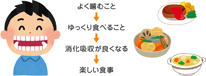 “噛む”ことがもたらす良いことは、何と言っても『消化吸収』の促進です。この理由として、しっかり噛むことで①だ液など消化液が分泌されること ②食べたものが細かくなるため、飲み込みやすく、胃や腸への負担も軽くなることなどが挙げられます。
