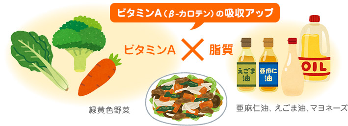 ビタミンAは“脂溶性ビタミン”といって、あぶらに溶ける性質があります。緑黄色野菜に多く含まれるビタミンA(β-カロテン)は、油で炒めて食べる、サラダに亜麻仁油やえごま油をかける、マヨネーズを使うなどの工夫で吸収率をアップさせることができます。