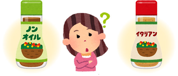 “ノンオイル”のドレッシングは、脂質が入っていないドレッシングです(既製品のドレッシングの場合は表示を見ればわかります)。特別の場合を除き、油を無理に避ける必要もありませんが、例えば油を使った料理が多い食事ではノンオイルタイプを使うようにしたり、食事から就寝までの時間が短いときに少しでも消化時間を短くするためにノンオイルタイプを使うようにするのもよいと思います。
