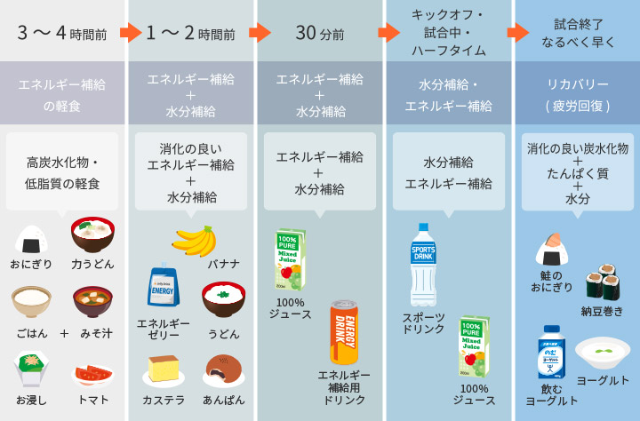 ②試合当日は、試合開始時刻の3~4時間前からエネルギー補給のための食事(補食)を摂るようにします。この時間は食べたものが消化されて、胃の中は空で、エネルギー源を満タンに蓄えるために必要な時間です。