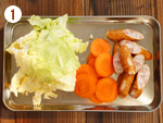 キャベツはざく切りに、にんじんは薄くスライス、ソーセージ半分の長さに切る。 ※にんじんはピーラーでリボン状にしてもOK!