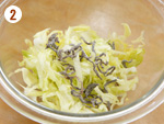 ボウルにレタスと塩昆布を入れて混ぜ合わせ、ごま油を回し入れる。
