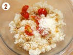 ボウルでミニトマト、ごはん、粉チーズ、しょうゆを混ぜ合わせ、お好みの形に成型する。※ラップを使って成形するとしっかり握ることができ、形が崩れにくく手も汚れません!
