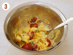 かぼちゃの粗熱が取れたら[A]を加えてかぼちゃを軽くつぶすように混ぜ、ミニトマトも加える。