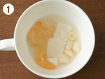 耐熱のスープカップにシーフードミックス、水、鶏ガラスープの素を入れ、電子レンジ600wで30秒間2回加熱する。※スープカップで1人分ずつ作ります。