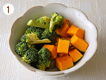 かぼちゃはと豆腐は1.5cm角に切り、ブロッコリーは小さ目に房分けする。