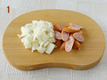 玉ねぎは1㎝の角切りに、ソーセージは斜め薄切りにする。
