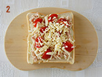 食パンに①の玉ねぎ、ツナ、4つ切りにしたミニトマトをのせて最後にチーズを全体に乗せる。