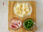 じゃがいもは皮をむき1.5cm角に切り、水にさらして水気を切ったのち、耐熱容器に入れてふんわりとラップをしたら600wの電子レンジで3分加熱する。ベーコンは1㎝幅に切る。