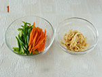 切干大根は水で戻して水気を絞る。にんじんは皮をむき、ピーマンはへたと種をとりそれぞれ千切りにする。