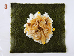 台の上にラップを広げ焼き海苔をのせ中心に(A)をあわせたコーンごはんの半量、②の順にのせる。