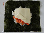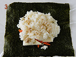 残りのごはんをかぶせるようにのせ、海苔の四隅を折りたたむ。