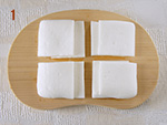 はんぺんは4等分にしてそれぞれ半分にスライスする。