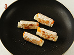 フライパンにごま油を入れて中火にかけ、②の巻き終わりを下にして全面の色が変わるまで焼き、水大さじ1/2(分量外)を加えて弱火で3~5分お餅が柔らかくなるまで加熱し、一旦取り出す。