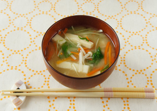 トップページ 時短レシピ 味噌汁レシピ 味噌汁レシピ 野菜たっぷりお味噌汁 調理時間10分以内 エネルギー64.4kcal/人 POINT ・えのきや水菜は食物繊維をたっぷりと含んでおり、根元を切り落とすことですぐに使えるので細かい処理が必要なく時短に向く食材です。 ・高野豆腐は鉄やカルシウムなどの不足しがちなミネラルを補うことが出来ます。細く切ることで食べやすくなります。 スタミナ味噌汁 調理時間10分以内 エネルギー140.1kcal/人 POINT ・忙しい朝に何品も作っていられない…という時にオススメなのがこちらのメニューです。豚肉は糖質をエネルギー源に変えるビタミンB1やたんぱく質を含みます。 ・こんにゃくに含まれる食物繊維は腸内環境を整えるのに役立ちます。 緑黄色野菜とはんぺんのお味噌汁 調理時間10分以内 エネルギー65.1kcal/人 POINT ・にんじんや小松菜などの緑黄色野菜には抗酸化成分が多く含まれているため、免疫力アップに役立ちます。 ・はんぺんはたんぱく質補給になるだけでなく、軽くてふわふわとした食感を楽しみながらいただけます。 春キャベツのお味噌汁 調理時間10分以内 エネルギー124kcal/人 POINT ・春キャベツは柔らかく、短時間で煮えるため朝の忙しい時のお味噌汁の具にオススメです。 ・大豆が原料である油揚げを使うとコクや旨味が出ます。さらにお餅を小さく切って加えることでごはんを食べないお子様の炭水化物(エネルギー源)補給としても役立ちます。 新じゃがとわかめのお味噌汁 調理時間10分以内 エネルギー77.8kcal/人 POINT ・新じゃがは皮が薄いため、皮をむく手間が省けて時短! ・じゃがいもに含まれるビタミンCは熱に強いため、季節の変わり目で体調が不安定になりやすいこの時期にオススメの食材です。 ・さらに体の機能を整えるミネラルを含むわかめをプラスしましょう。 時短レシピ一覧に戻る