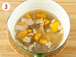 豚肉に火が通ったら、こんにゃくとかぼちゃ、だし汁を加えて中火にかける。