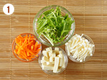 水菜とえのきは根元を切り落とし、4~5㎝の長さに切る。にんじんは皮をむいて長さ4~5㎝の細切りにする。