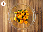 かぼちゃは1.5㎝角に切り、耐熱ボウルに入れてラップをふんわりとかけ電子レンジ600wで2~3分柔らかくなるまで加熱する。