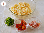 ベーコンは5㎜幅に切り、小ねぎは小口切りにする。ミニトマトは半分に切る。ごはんに溶きほぐした卵とカレー粉を和えておく。