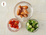 ソーセージは斜め3等分に切る。オクラは板ずりをして5mm幅に切り、ミニトマトは半分に切る。