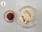 ①のささみは手で裂き、梅干しは包丁でたたく。
