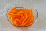 かぼちゃは2㎝角に切り、にんじんはピーラーでリボン状にする。高野豆腐は水で戻した後、8等分に切る。