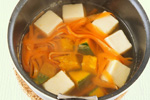 だし汁にかぼちゃとにんじん、高野豆腐を入れて中火にかける。