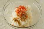 ごはんに干しえびと白ごまを混ぜ合わせて2等分し、おむすびにする。