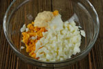 玉ねぎが透き通ってきたら鶏ひき肉をを加え炒め合わせ、ミックスベジタブルも加える。