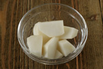 かぶは皮をむいて4つ割に、葉は2~3㎝の長さに切る。木綿豆腐はスプーンや手でひと口大にランダムに割る。