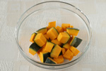 南瓜は1.5~2㎝角に切り、耐熱ボウルに入れてラップをし600wの電子レンジで3分加熱する。