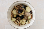 鍋にごま油と豚肉を入れ中火で炒め、肉に火が通ったら椎茸、茄子を加えさっと炒める。