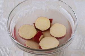 さつまいもは1㎝厚に切り水に5分ほどさらしたあと、水気を切り耐熱容器に入れふんわりとラップをし、600wの電子レンジで3~4分柔らかくなるまで加熱する。
