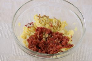 コンビーフは電子レンジ500wで30秒ほど加熱し、ほぐしておく。