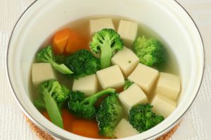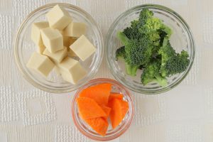高野豆腐は水で戻しひと口大に切る。ブロッコリーは小房に分け、にんじんは乱切りにする。