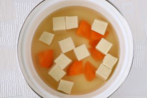 鍋にだし汁と高野豆腐、にんじんを入れ、中火にかける。