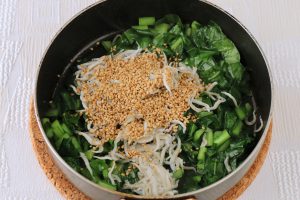 - ・緑黄色野菜でカルシウムも含む小松菜はごま油で香ばしく炒めるとカサも減ります。