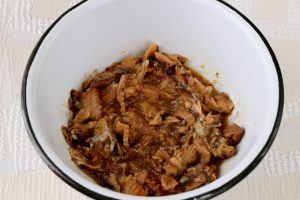 いわしの味噌煮缶は汁ごとボウルにあけ、身をあらくほぐす。