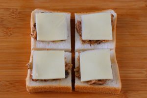 食パンとスライスチーズを4等分に切り、食パン、①、スライスチーズの順にのせる。