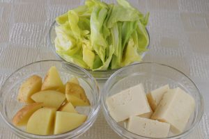 キャベツは細切りにし、新じゃがは皮ごと2㎝角に切る。豆腐は食べやすい大きさにに切る。