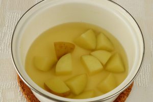 鍋にだし汁と新じゃがを入れ蓋をし、中火で5分ほど煮る。