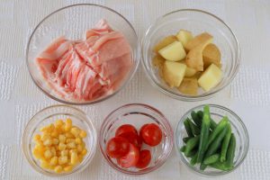 豚ロースはひと口大に切る。いんげんは半分の長さに切る。じゃがいもは2㎝角に切り、ミニトマトは半分に切る。