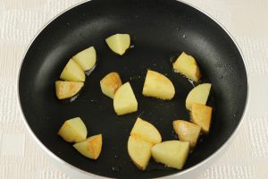 フライパンにオリーブ油を入れ中火にかけ、豚肉とじゃがいもを炒める。